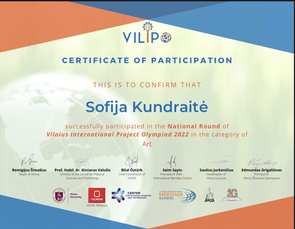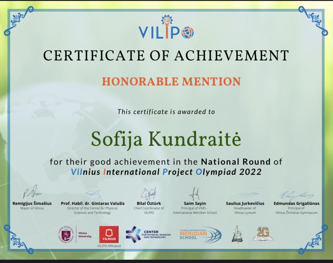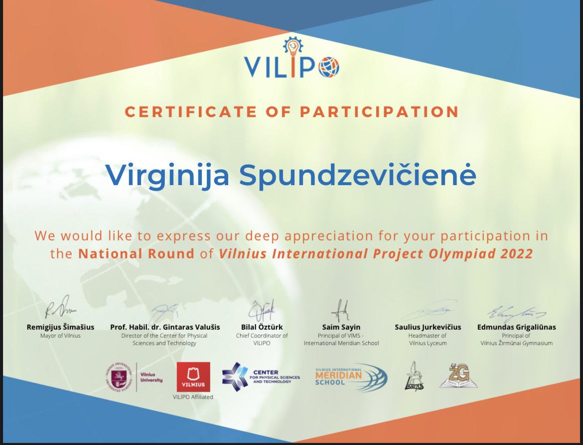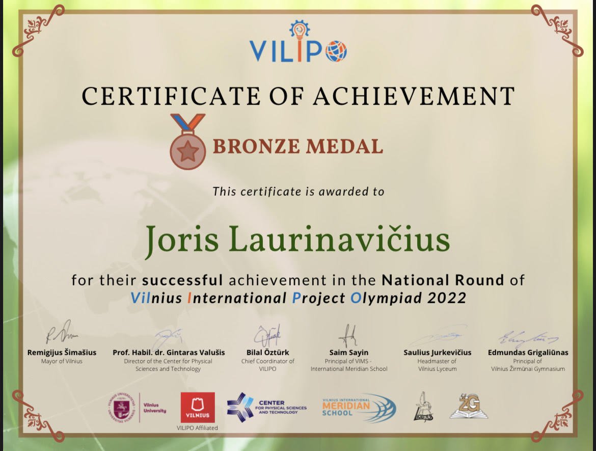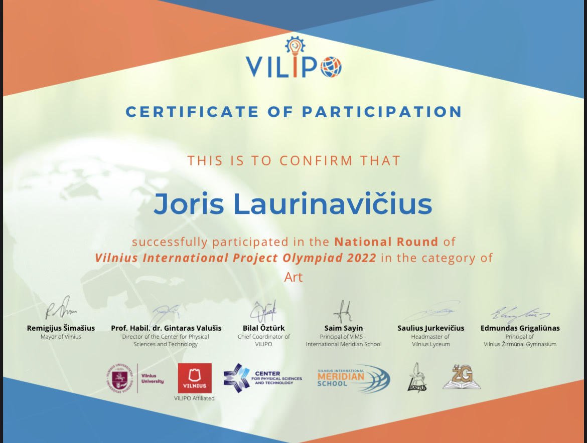 Joris Laurinavičius ir Sofija Kundraitė 8a klasės mokiniai sėkmingai dalyvavo tarptautinėje projektų olimpiadoje Vilipo 2022. Joris užėmė trečią vietą ir apdovanotas bronzos medalio diplomu, Sofija - garbės raštu.