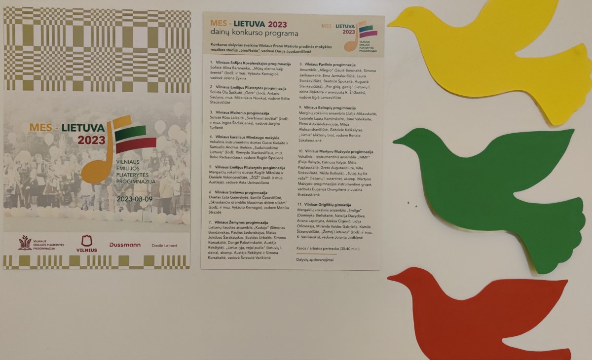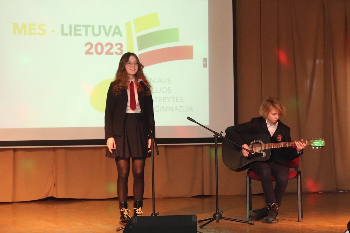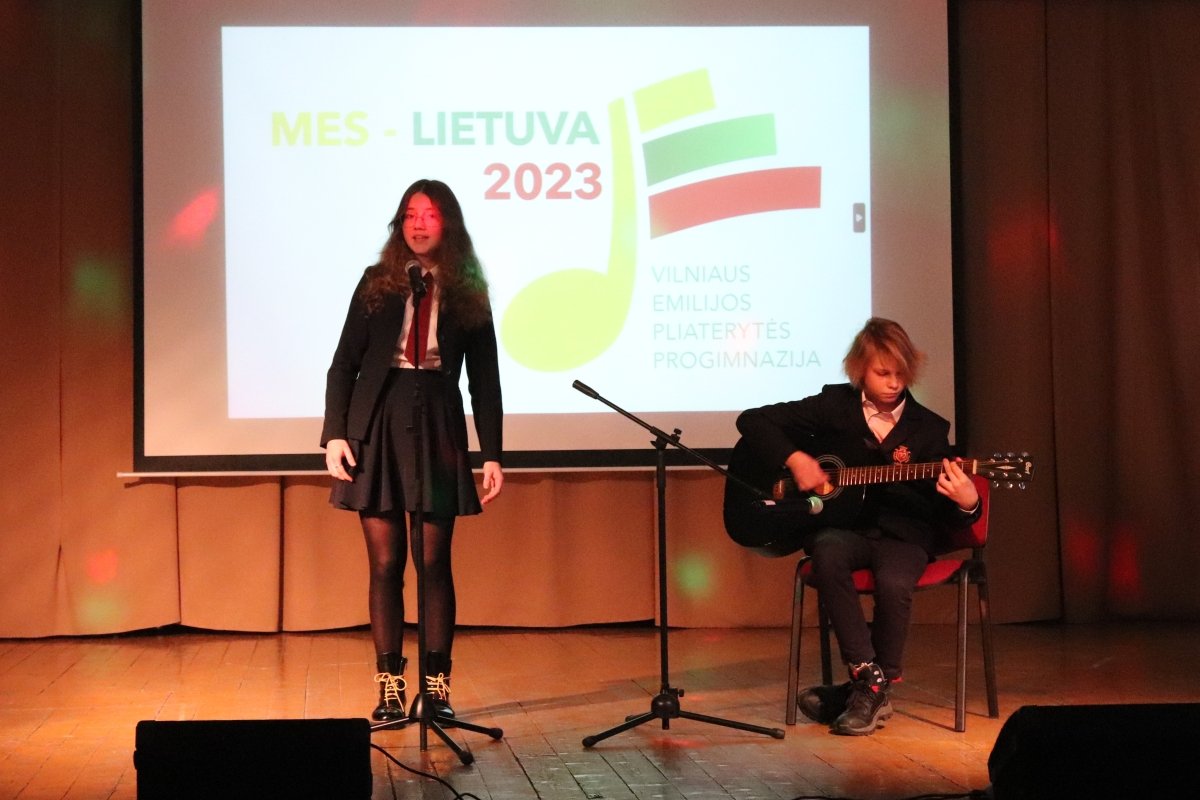2023 m. kovo 9 d. Vilniaus Emilijos Pliaterytės progimnazijoje vyko dainų konkursas ,,Mes - Lietuva". Šiame konkurse dalyvavo ir mūsų mokyklos mokiniai - Gustė Kielaitė ir Samuelis Andrius Bielskis kartu su muzikos mokytoja Rugile Šipeliene. Konkurse dalyvavo Vilniaus mokyklų mokinių kolektyvai, ansambliai, duetai. Vertinimo komisiją sudarė Lietuvoje žinomi dainininkai - operos solistas Merūnas Vitulskis, dainininkė Aistė Pilvelytė, Lietuvos balso konkurso nugalėtoja Kotryna Juodzevičiūtė, buvusios šio konkurso dalyvės ir nugalėtojos.