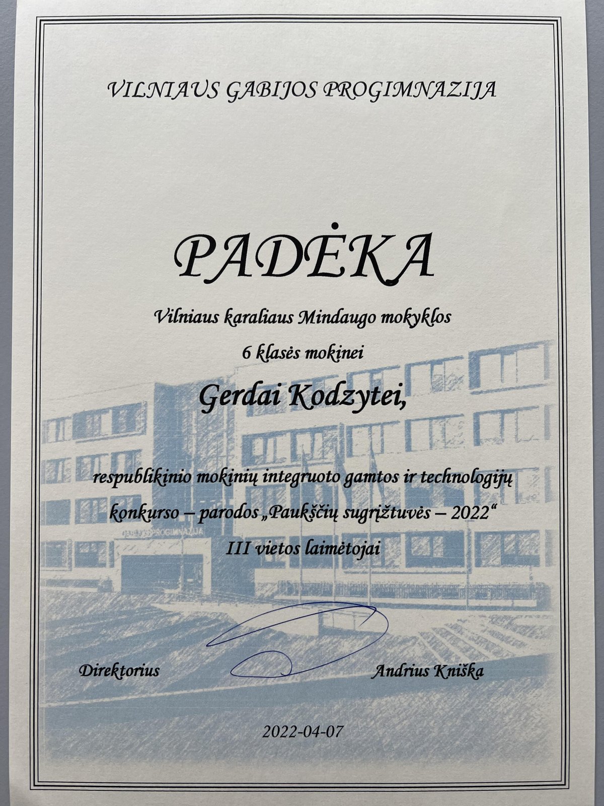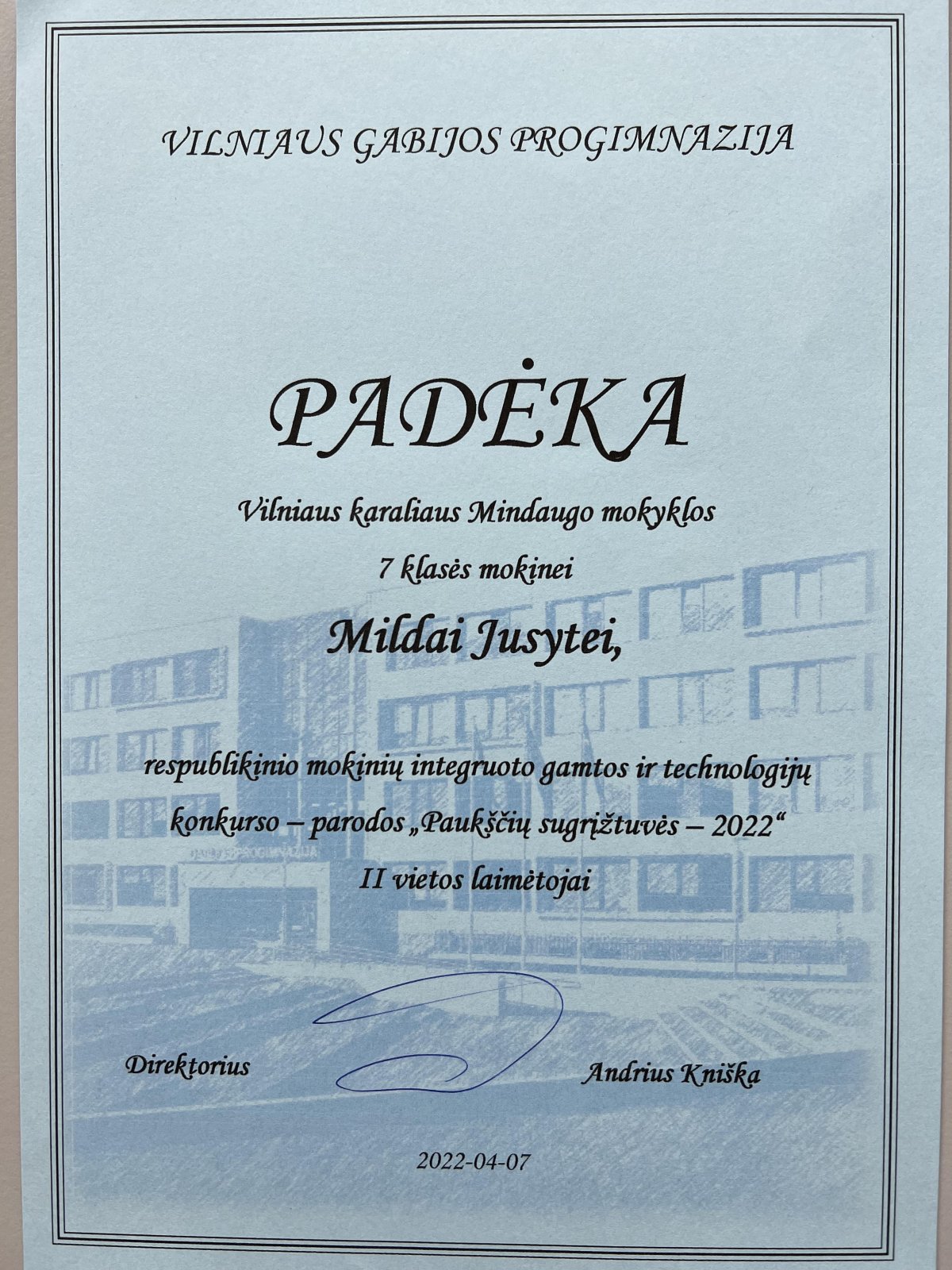 Į Vilniaus karaliaus Mindaugo mokyklą susurinko nemažas būrys Lietuvos paukščių. Parodoje buvo galima išvysti 5-8 klasių mokinių sukurtus paukščius: gervę, zylę, kirą, kielę, genį, antį. Geriausieji apdovanoti Vilniaus Gabijos progimnazijoje vykusiame konkurse, antrosios ir trečiosios vietos diplomais. Mokiniai ne tik kūrė paukščius, bet ir surinko bei pateikė išsamią informaciją apie juos. Sveikiname 7b kl. mokinę Mildą Jusytę ir 6b kl. mokinę Gerdą Kodzytę.