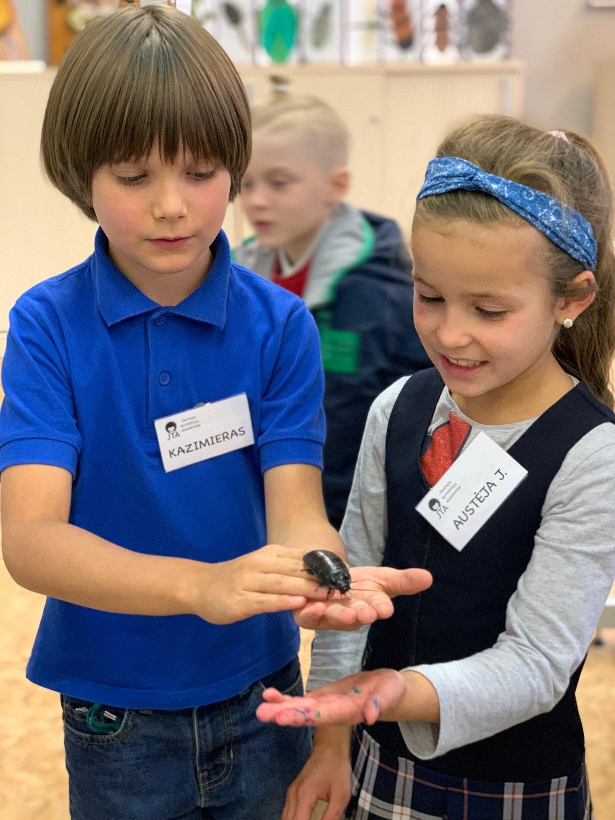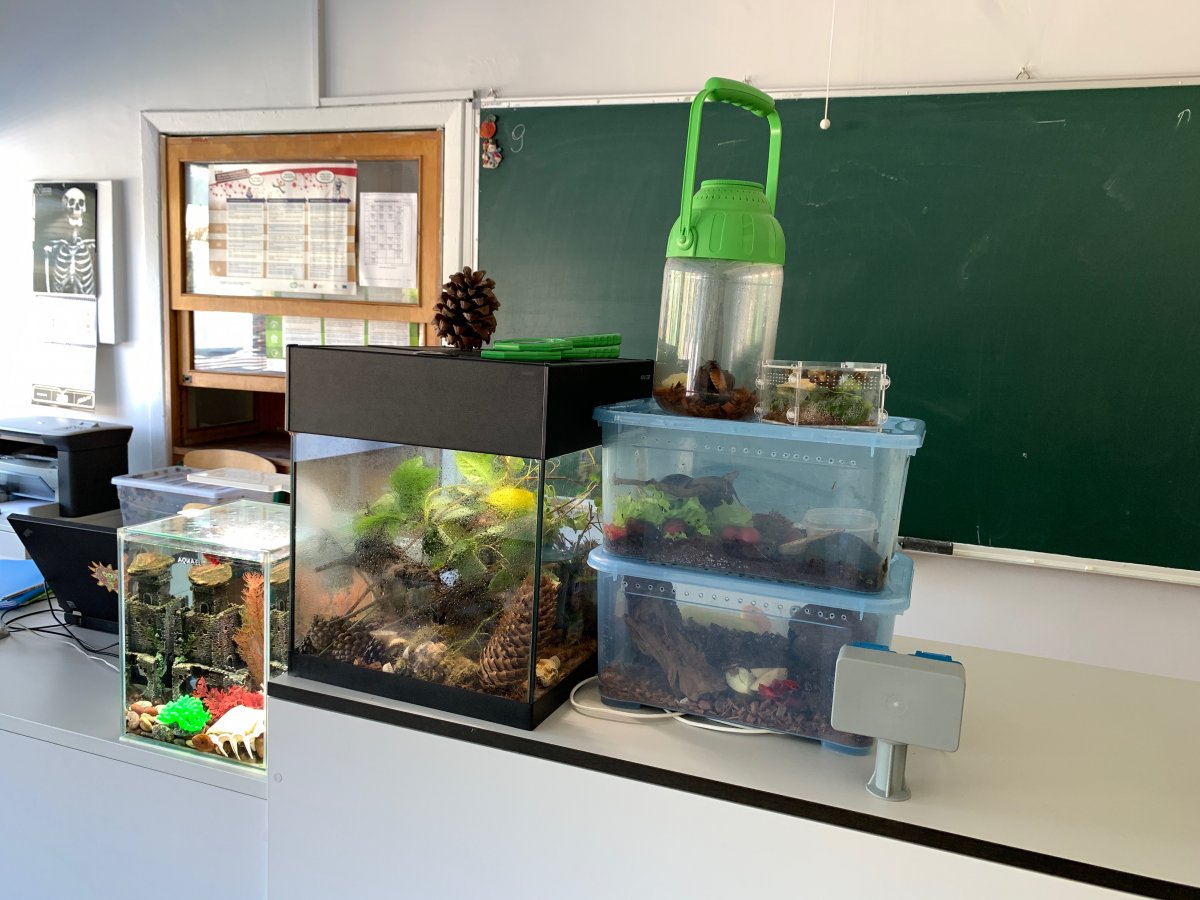 Mūsų mokyklos gyventojai: didžiausia sausumos sraigė Slaimas, keletas šnypščiančių šešiakojų vyrukų iš Madagaskaro, visas būrys vietnamietiškųjų gyvalazdžių ir ne itin draugiškos žuvytės - gaideliai. Daugiau apie juos taip pat pamatysite vaizdinėje medžiagoje.