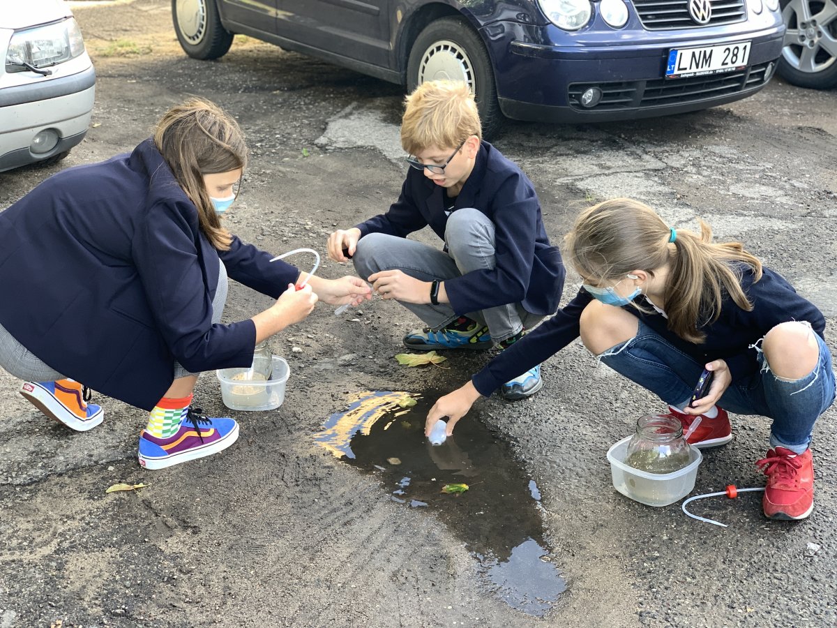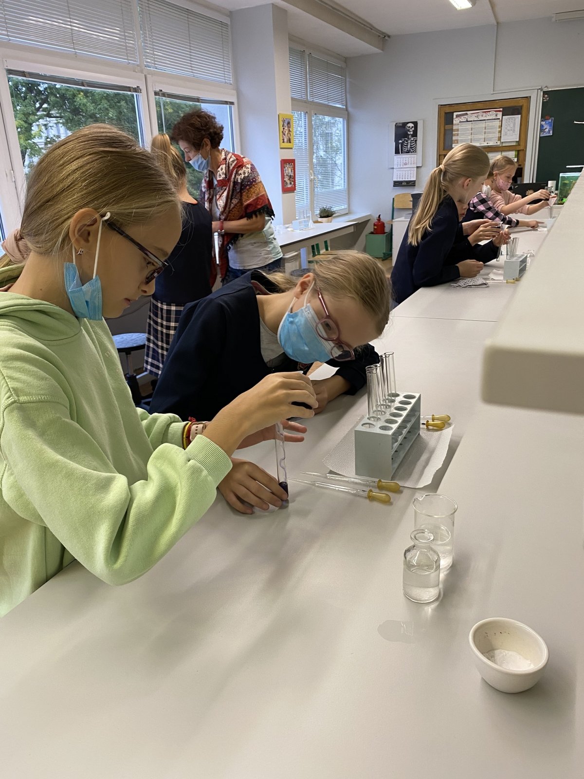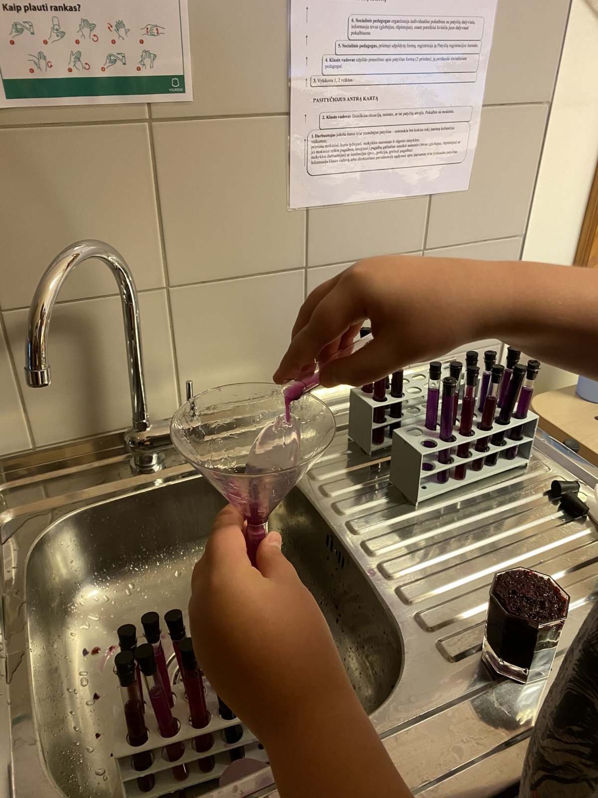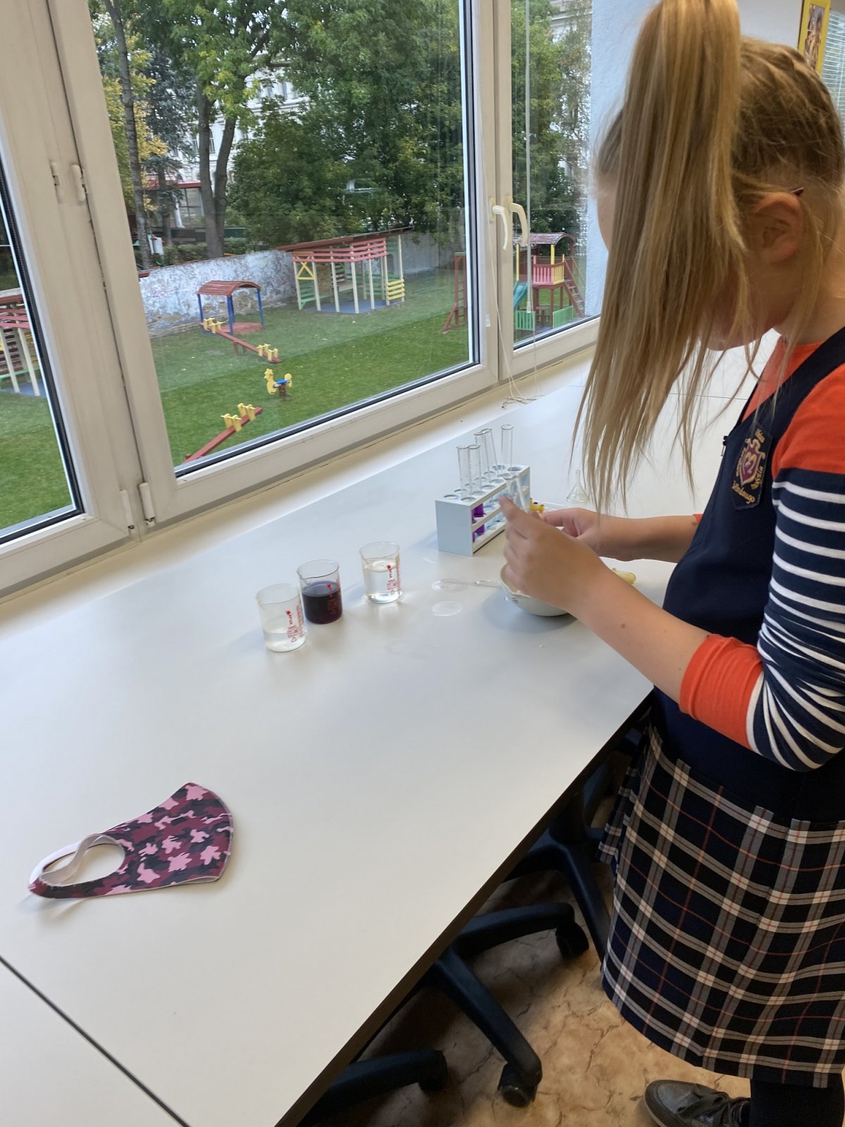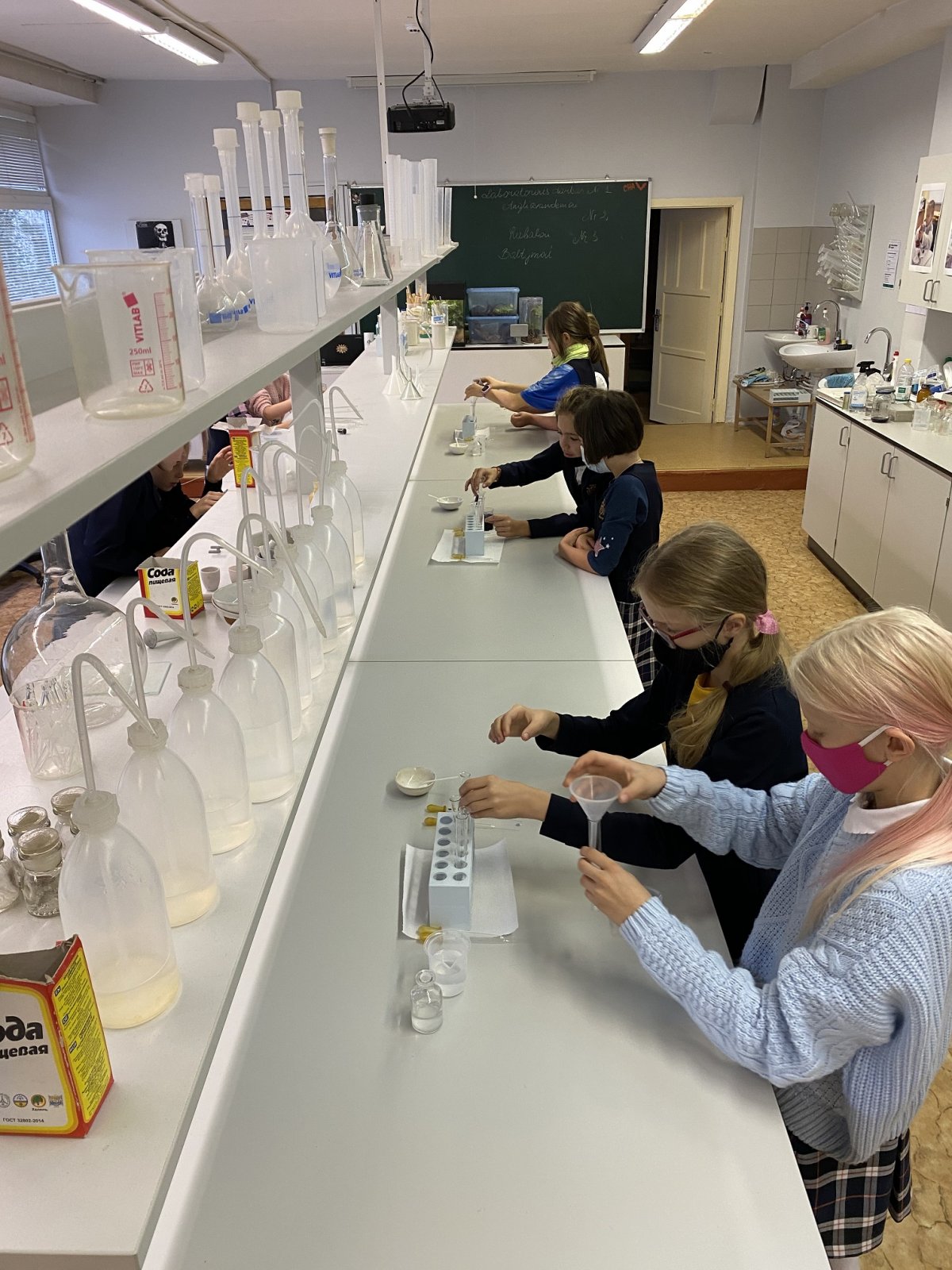 Rugsėjo mėnesį iš mokyklos aplinkoje esančių objektų (balos vandens, šakelių, augalų) pagamino mirkinius, kuriuose užsiveisė mikroorganizmai klumpelės. Mikroskopu stebėjo klumpelių reakciją į įvairius gėrimus: kavą, arbatą, limonadą, sultis, pieną ir kt. Rezultatus pateikė skaidrių pristatymuose. Mokiniai iš raudongūžio kopūsto gamino indikatoriaus tirpalą. Raudongūžio kopūsto tirpalu buvo tiriami rūgštiniai ir šarminiai tirpalai, vykdomos neutralizacijos reakcijos.