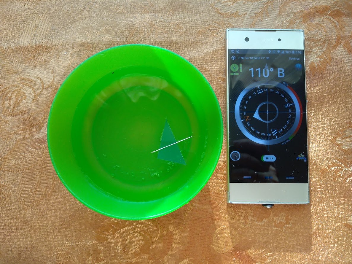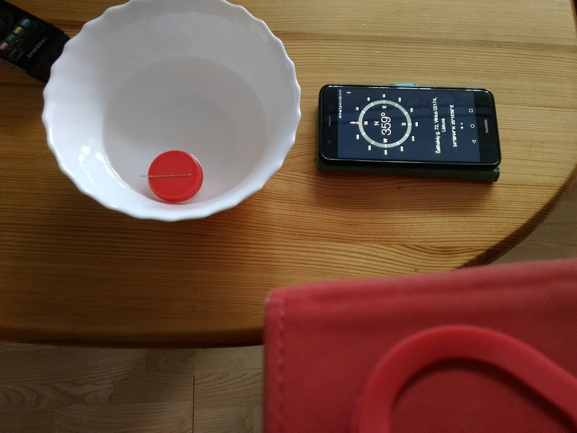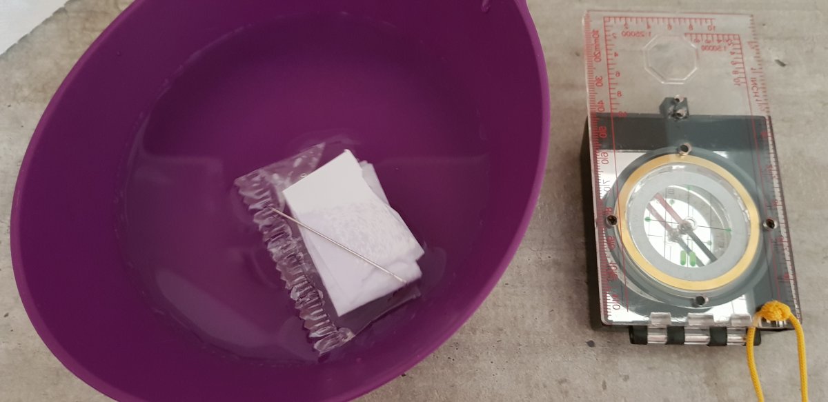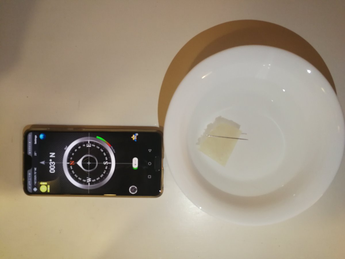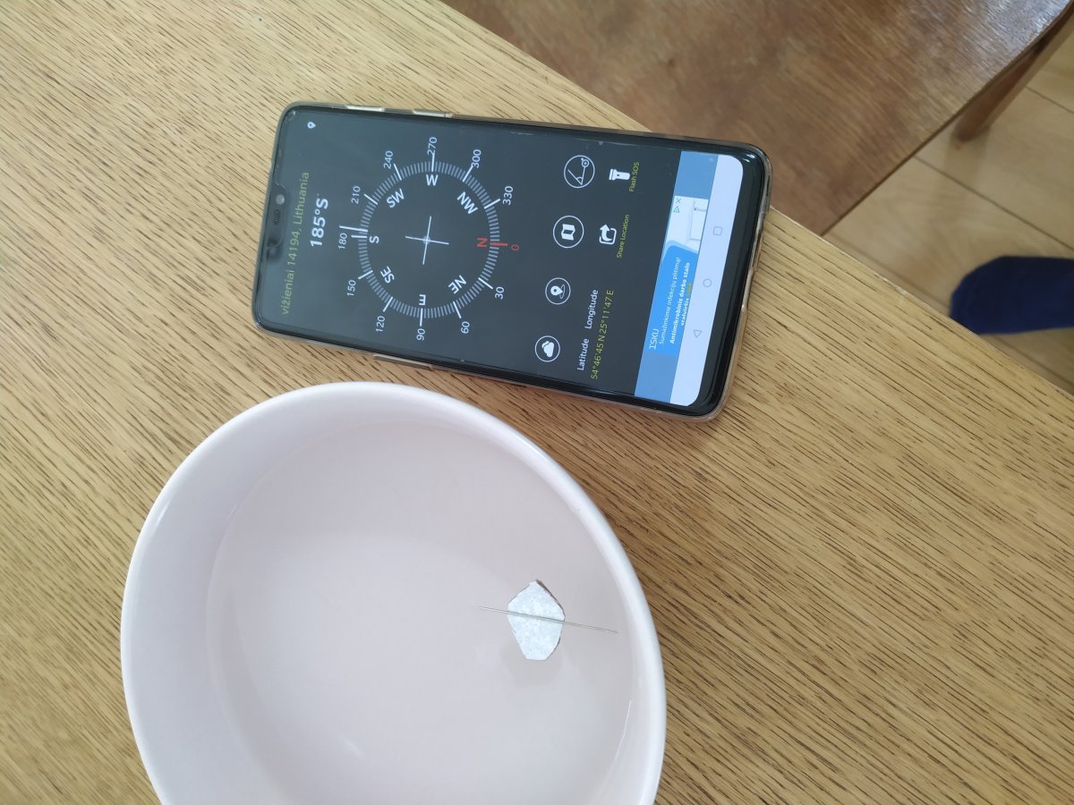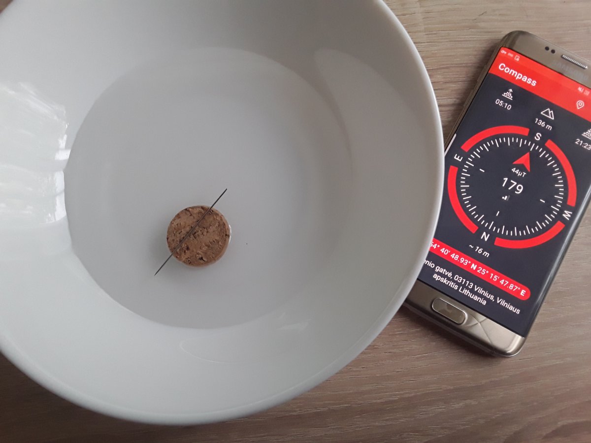Ar žinote, kad namuose netgi nuotolinio ugdymo metu galima pasigaminti tikrų tikriausią kompasą? Įmagnetinus adatą ir padėjus ją ant vandenyje plūduriuojančio kartono ar kamščio gabalėlio, adata pasisuka šiaurės-pietų kryptimi. Netikite? Palyginkite gautą rezultatą su tikru prietaisu. Mūsų mokiniams pavyko.
