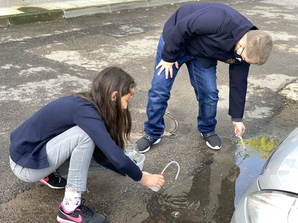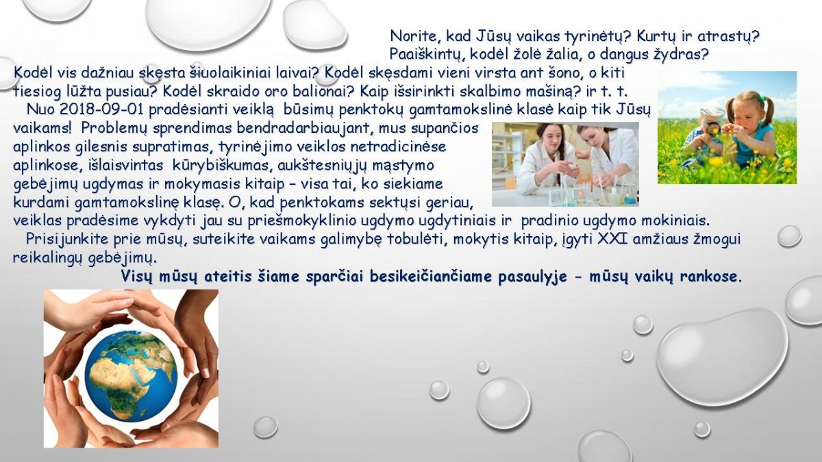 Spalio mėnesį antrų klasių mokiniai domėjosi kokios yra augalų lapų rūšys, kaip jie skirstomi, kokia jų sandara? Pasiruošė lapų pjūvių preparatus ir juos stebėjo mikroskopu. Skirtingų rūšių termometrais matavo vandens temperatūrą, aiškinosi kaip jie veikia, sužinojo skalės padalų vertę, išmoko nustatyti temperatūrą.