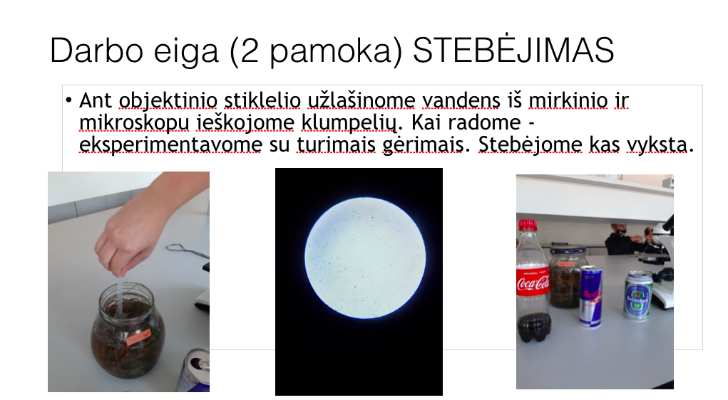 Lapkričio mėnesį tiriamuosius darbus atliko nuotoliniu būdu. Aiškinosi mitus ir tiesą apie gėrimą kokakolą. Stebėjo kaip keičiasi įvairūs organinės ir neorganinės kilmės objektai, veikiami kokakolos . Rezultatus pateikė skaidrių pristatymuose.
