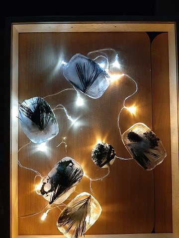 Užšaldytus savo kūrybinius eksperimentus 1c klasės mokiniai stebėjo lempučių šviesoje.