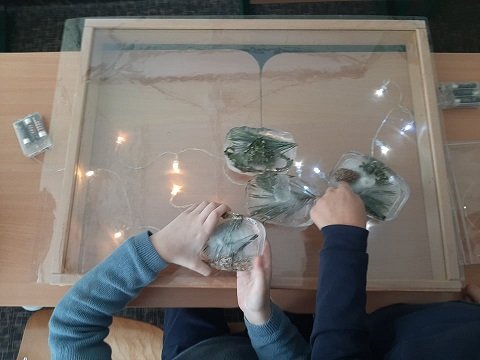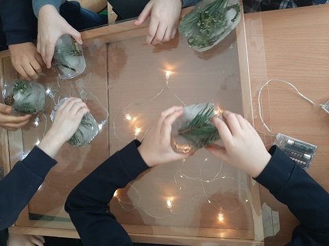 1c klasės mokiniai pasaulio pažinimo pamokose atliko praktinį darbą "Gamtos dalelė lede". 1 sauja gamtos gėrybių (pušų, tujų šakelių, kankorėžių ir kt. ) +1 stiklinaitė vandens +3 lašeliai kantrybės = netikėtas rezultatas!