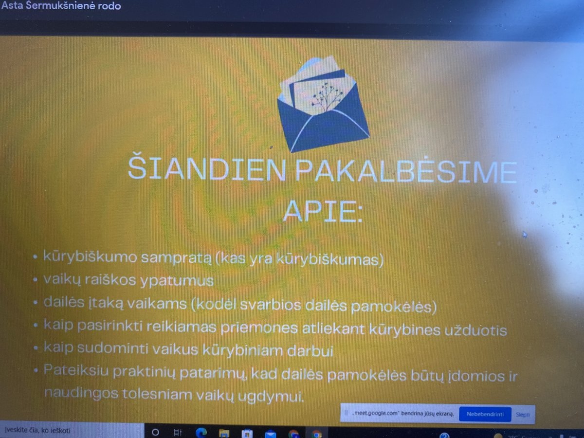 Bendradarbiavimo valanda tema: Praktiniai mokymai priešmokyklinukų kompetencijų ugdymui: dailė. |