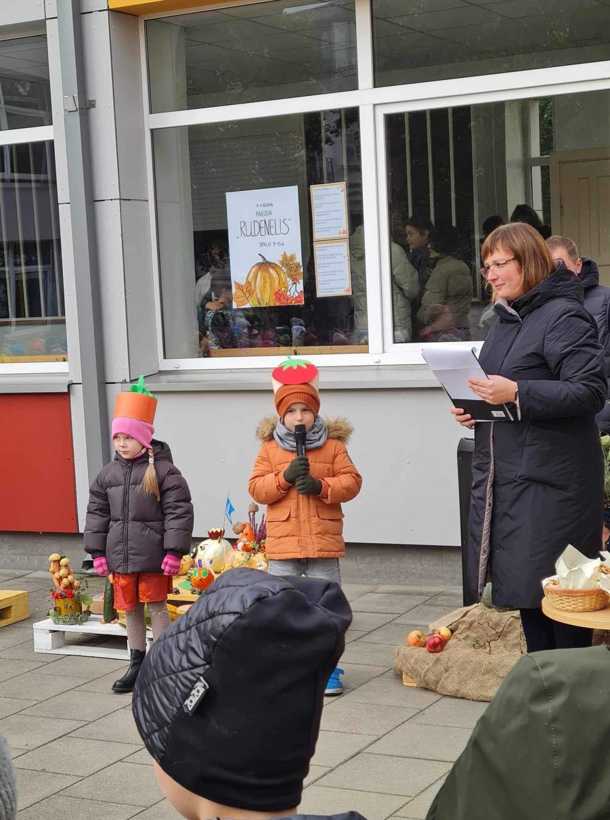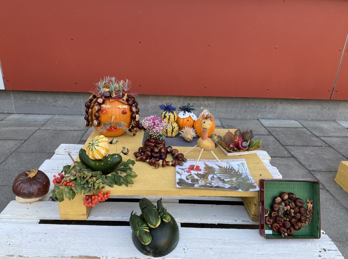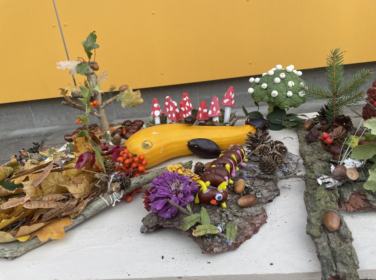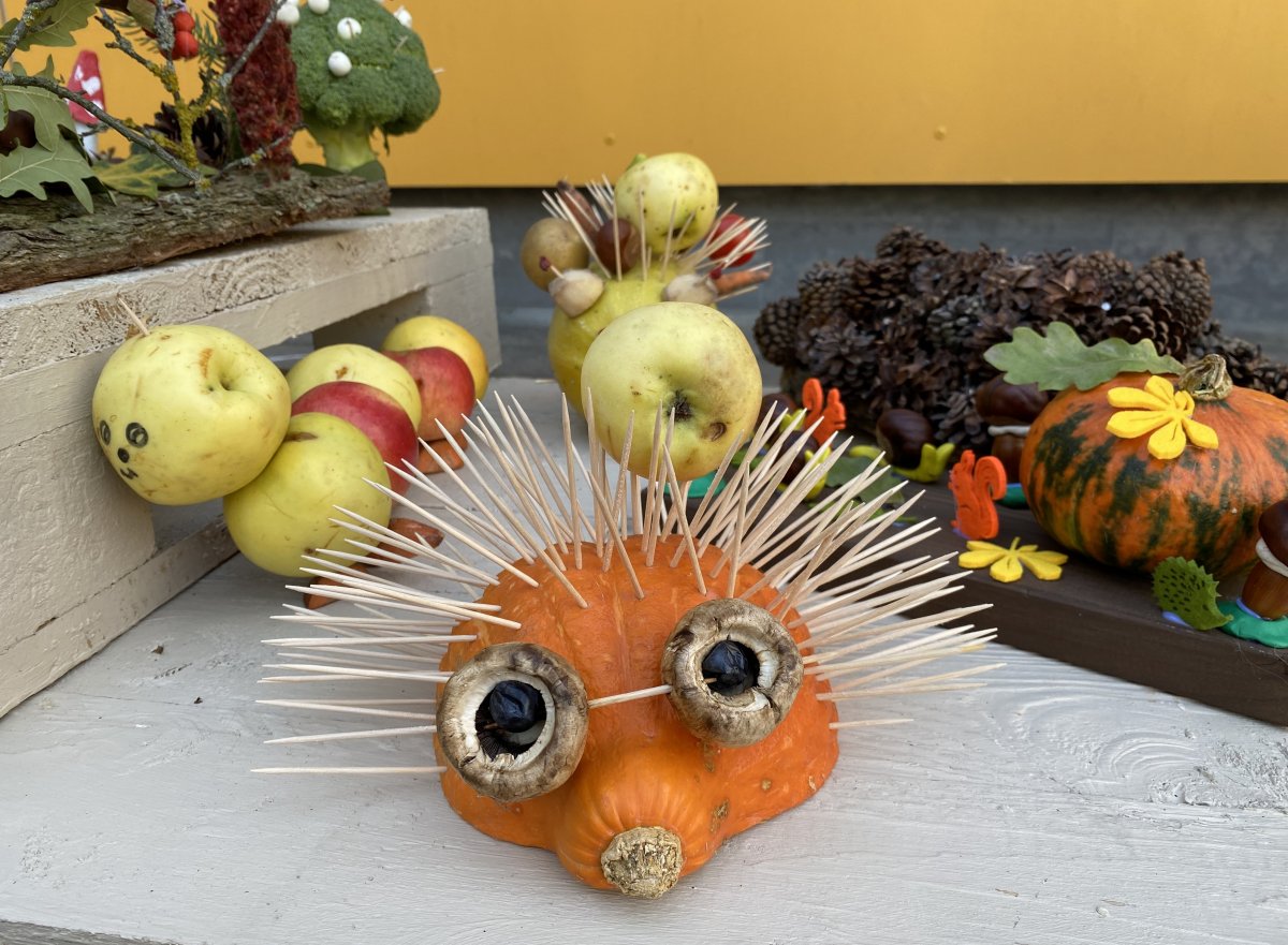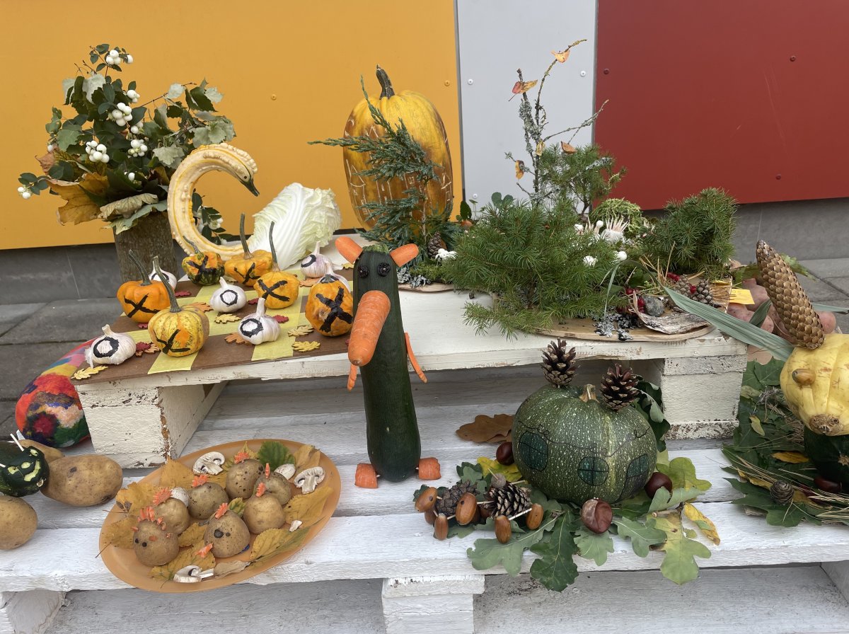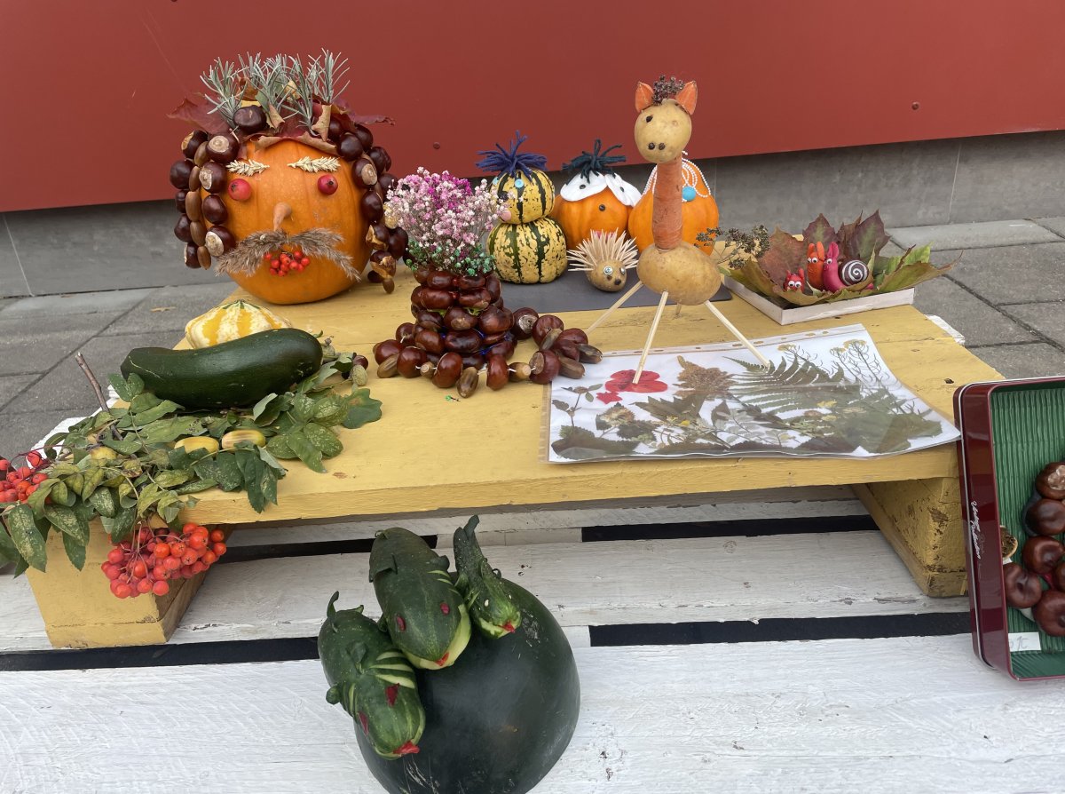 Mokiniai kartu su tėveliai, mokytojai pristato savo kūrybinius darbelius iš daržovių, vaisių, gamtinių medžiagų.