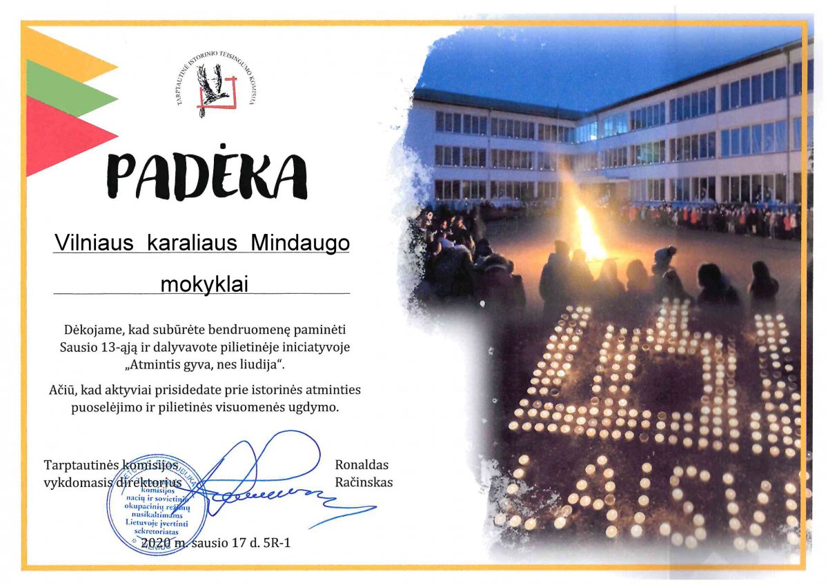 Sausio 13- osios rytą Vilniaus karaliaus Mindaugo mokyklos bendruomenė kartu su visa Lietuva dalyvavo pilietinėje akcijoje „Atmintis gyva, nes liudija“, paminėjo tragiškų Sausio 13-osios įvykių 29-ąsias metines ir Laisvės gynėjų dieną. 8 valandą mokyklos languose sužibo atminimo žvakutės, neužmirštuolių žiedais pasipuošę mokiniai, mokytojai, tėveliai klausė radijo informacijos, tylos minute pagerbė 14 žuvusių didvyrių atminimą. Vyko vienybės, atminties, meilės Tėvynei pamokos, buvo dainuojamos patriotinės dainos.
