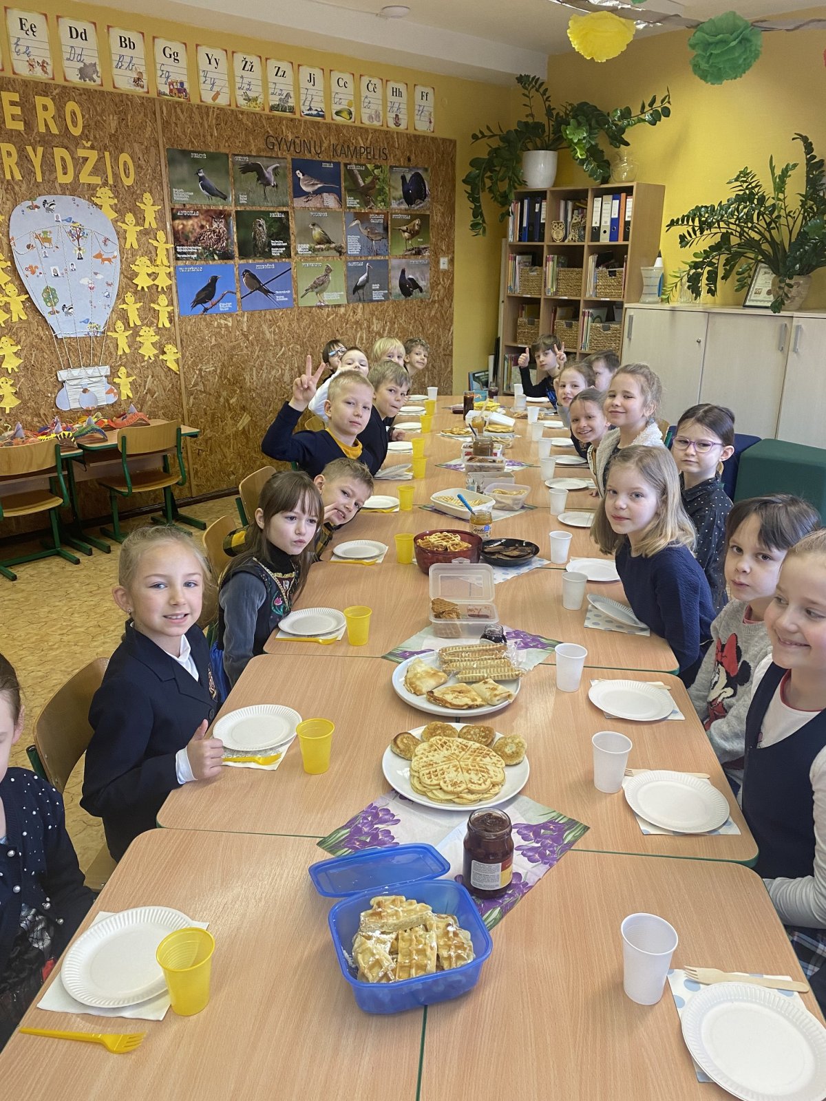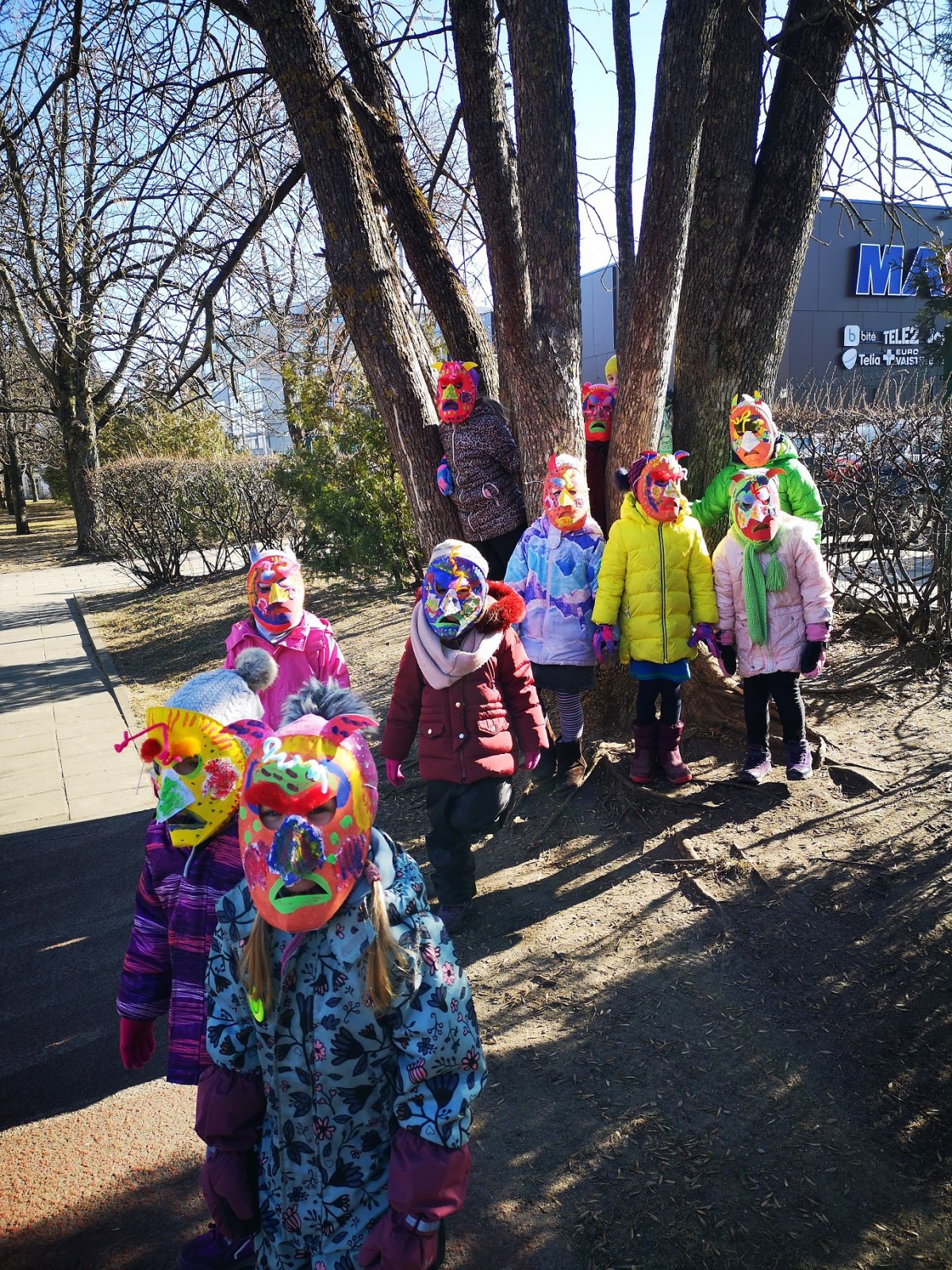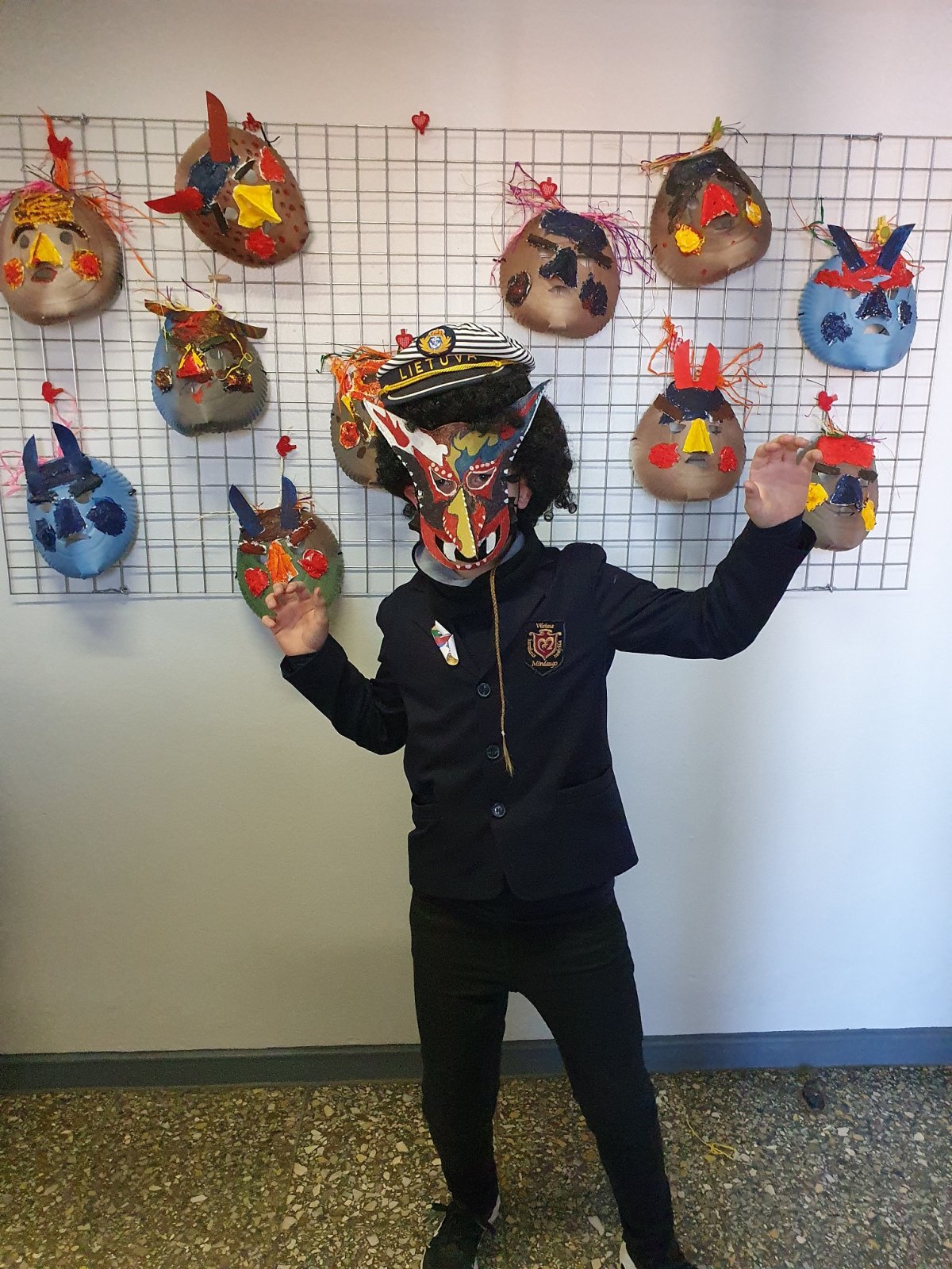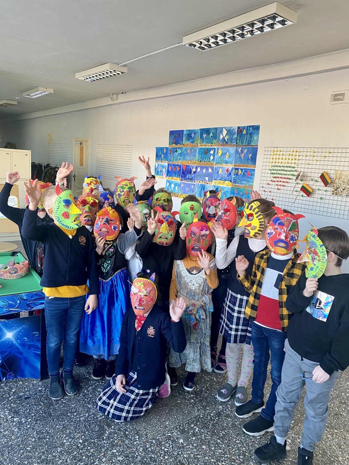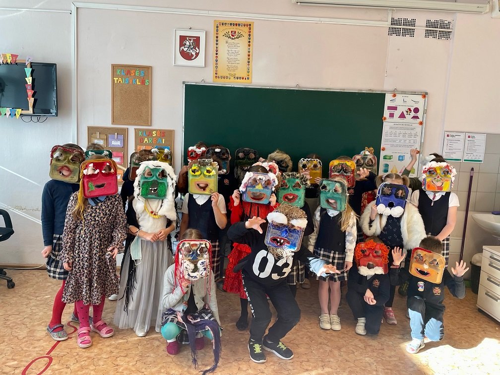 1-4 klasių mokiniai gamino kaukes, vaišinosi blynais.