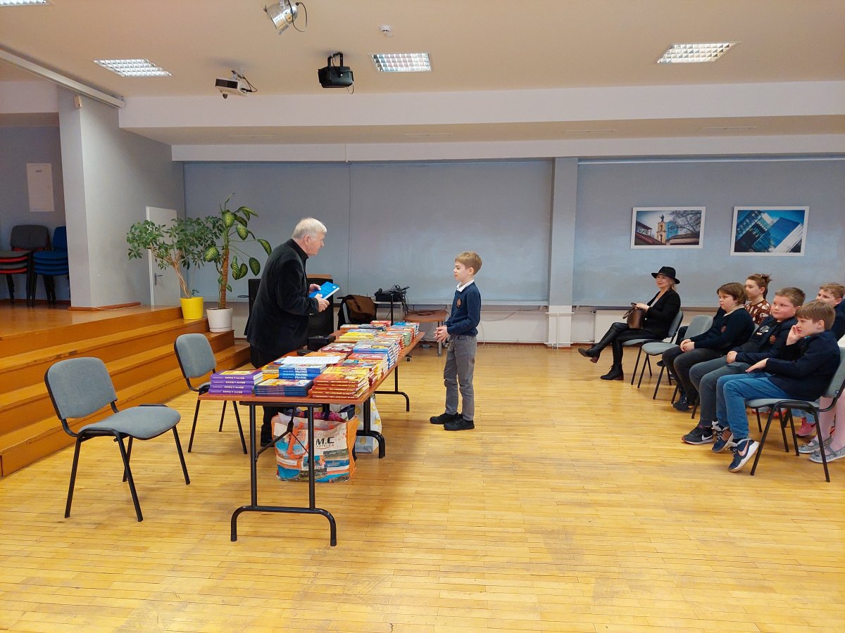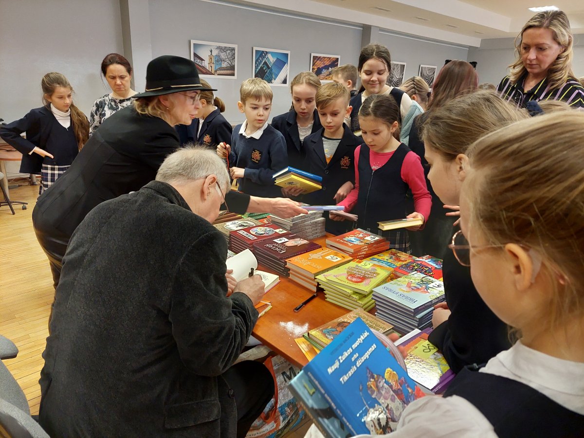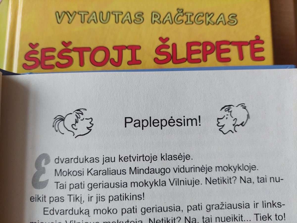 Saulėtą kovo antradienį į aktų salę vieni po kitų skubėjo jaunesnieji mindaugiečiai susitikti su rašytoju Vytautu Račicku. Nekantriai laukę ir pagaliau sulaukę garbingo svečio, vaikai susidomėję klausėsi gyvo rašytojo žodžio, drąsiai uždavinėjo dirbant grupėse iš anksto sugalvotus klausimus, rikiavosi į eilę gauti rašytojo autografo. Ir mokiniams, ir mokytojams daug džiaugsmo suteikė žinia, jog rašytojo V. Račicko knygoje ,,Kita šlepetės istorija“ minima ir Vilniaus karaliaus Mindaugo mokykla. Iš aktų salės vaikai išėjo kupini geriausių emocijų, nešini naujausiomis rašytojo knygomis, pasiryžę skaityti.
