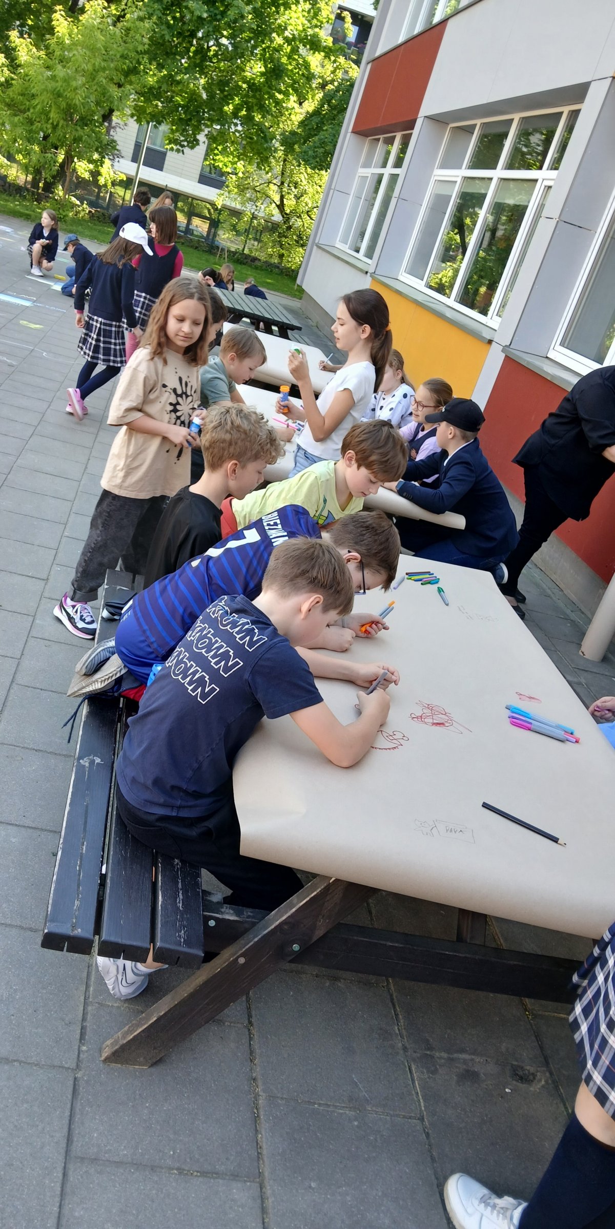 5-9 kl. mokiniai ilgosios pertraukos metu taip pat kvietėme piešti piešinius ,,Svajonę turiu...“ (Mindaugo g. pusė), dalyvauti aktyviose veiklose su fizinio ugdymo mokytojais Simonu ir Daivaru (mokyklos aikštynas).