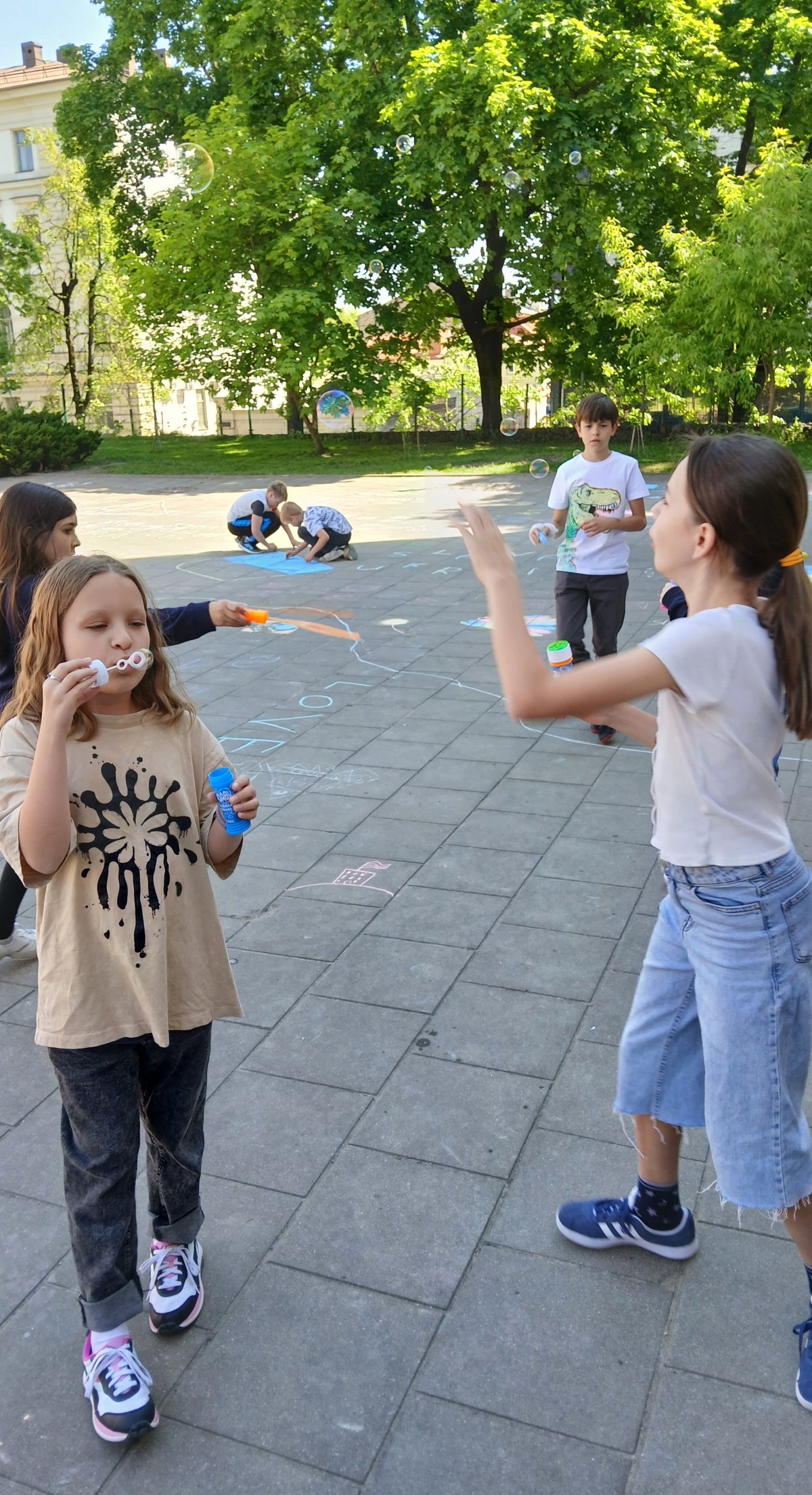 PUG ugdytiniai, 1-4 kl. mokiniai ilgosios pertraukos metu kvietėme į kiemą (Mindaugo g. pusė) piešti piešinius ,,Svajonę turiu...“, žaisti bendrus žaidimus, pūsti muilo burbulus, piešti su kreidelėmis.