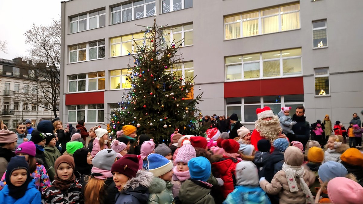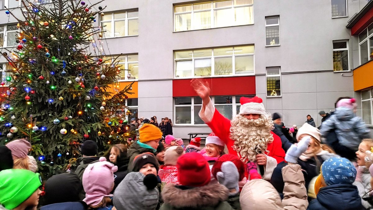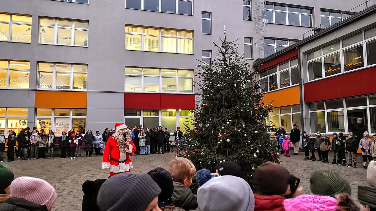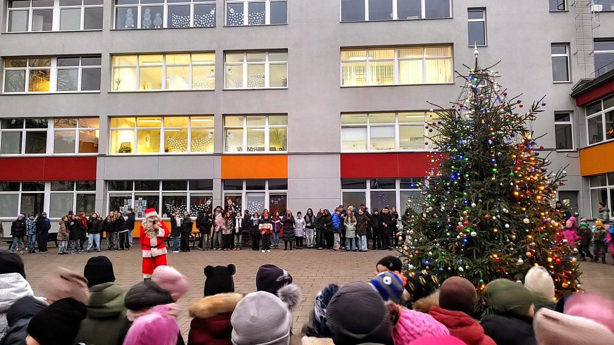 Kalėdų senelis mokyklos kieme kartu su mokiniais, mokytojais ir tėveliais įžiebė eglutę, kuri nušvito tūkstančiais švieselių.
