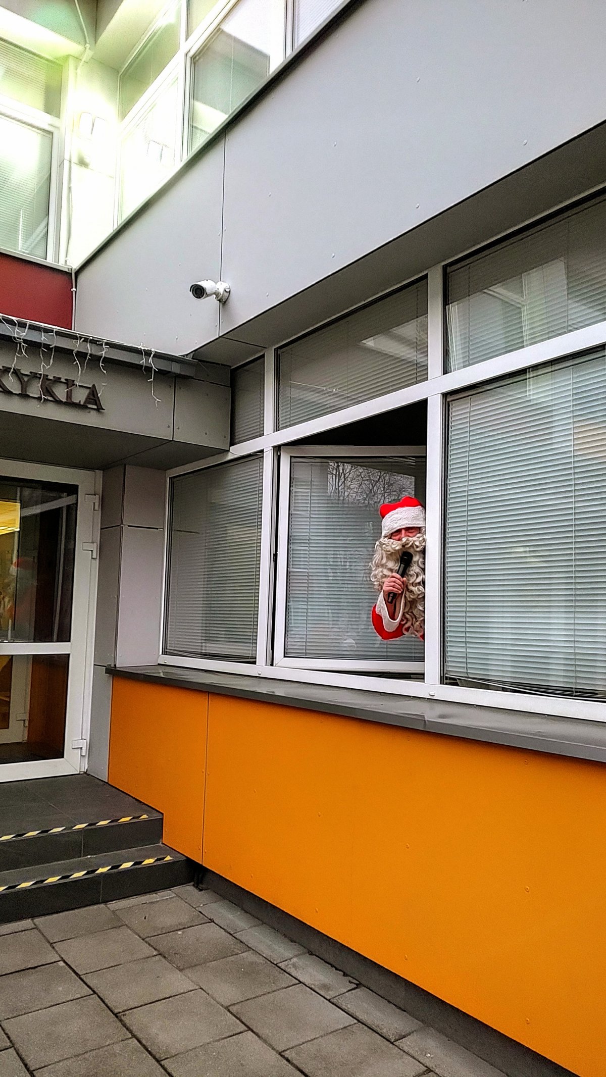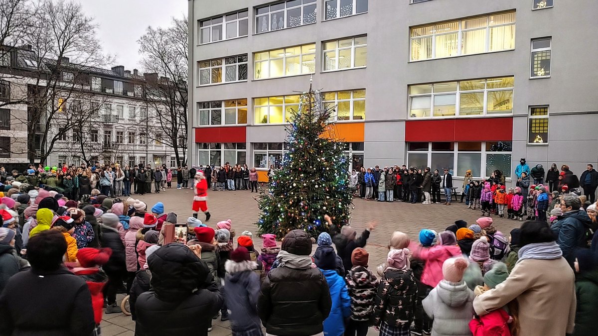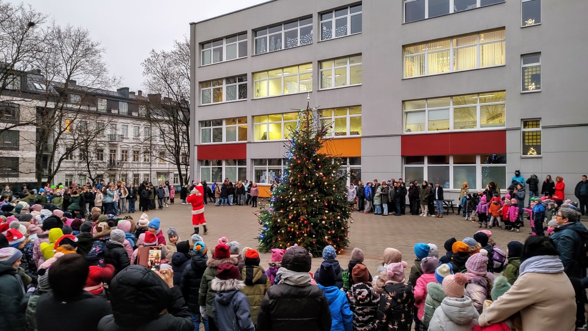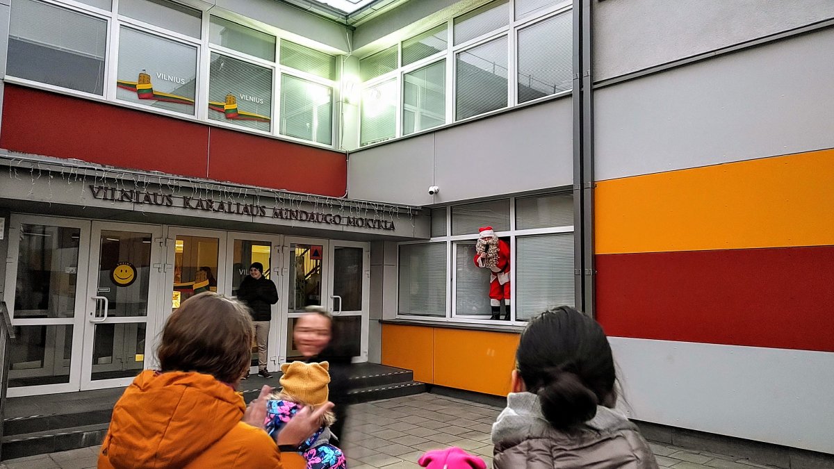 Kalėdų senelis mokyklos kieme kartu su mokiniais, mokytojais ir tėveliais įžiebė eglutę, kuri nušvito tūkstančiais švieselių.
