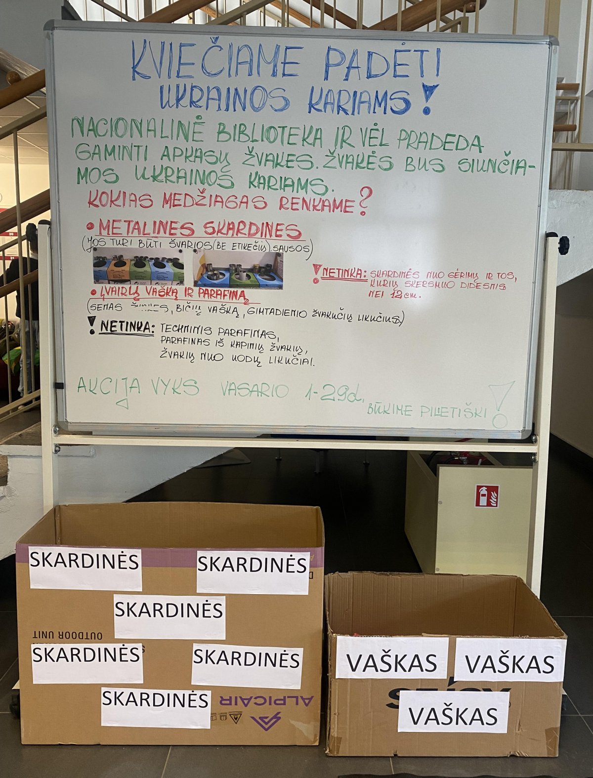 Nacionalinė biblioteka ir vėl pradeda gaminti apkasų žvakes. Žvakės bus gaminamos ir siunčiamos fronte kovojantiems Ukrainos kariams. Šios žvakės – tai vašku ar parafinu užpildytos skardinės, kurias apkasuose kariai naudoja gamindami maistą, džiovindami drabužius ar tiesiog norėdami sušilti, todėl jos gyvybiškai svarbios, kai šalta.